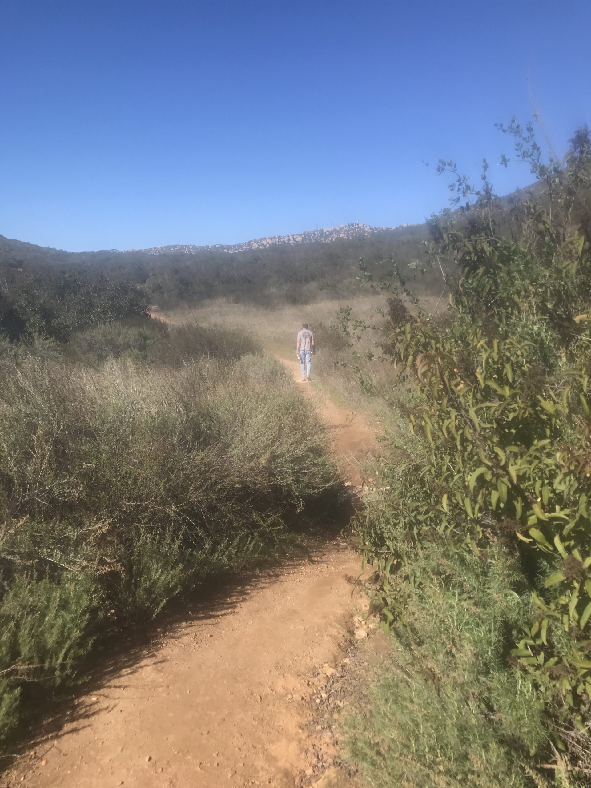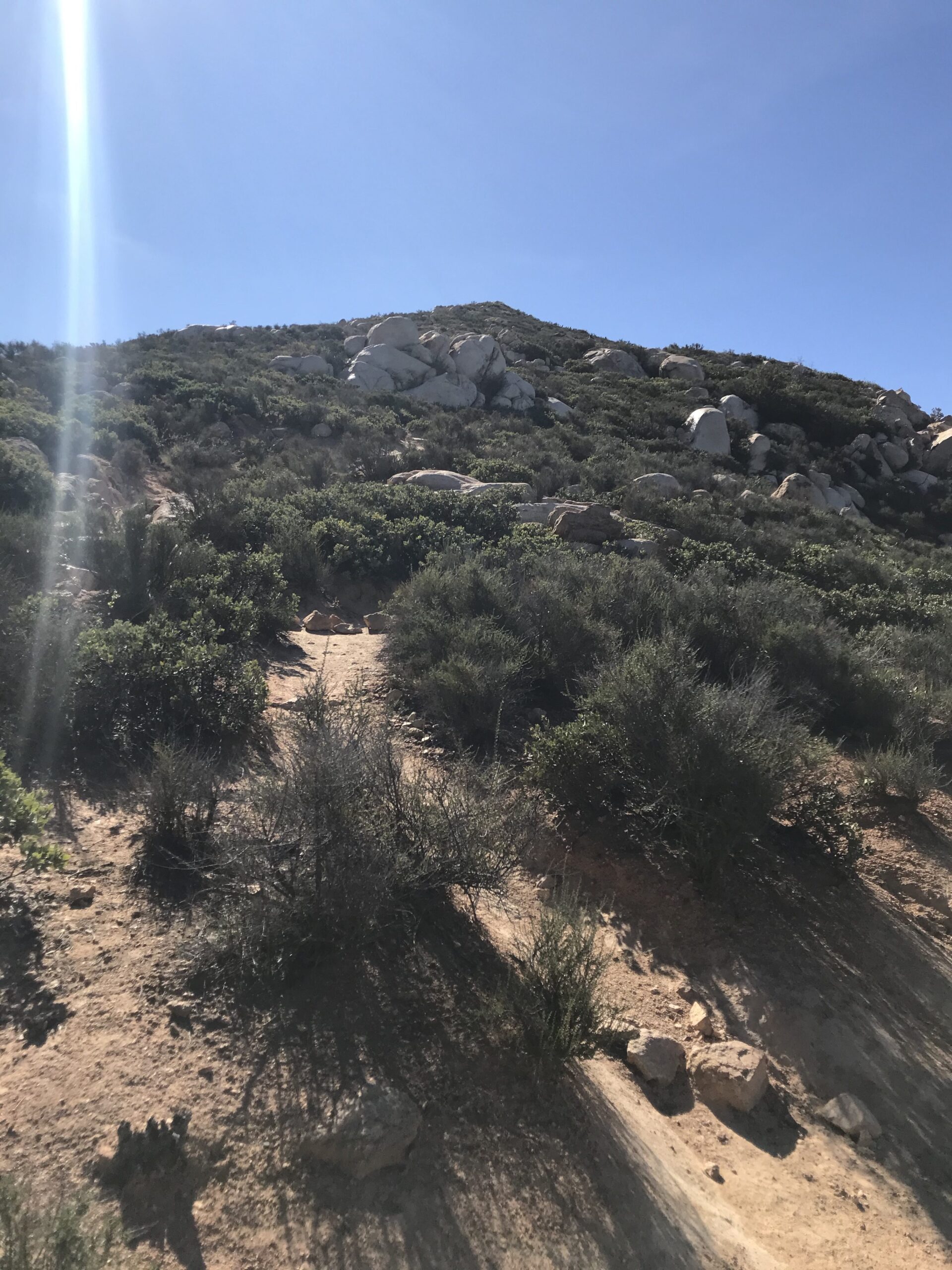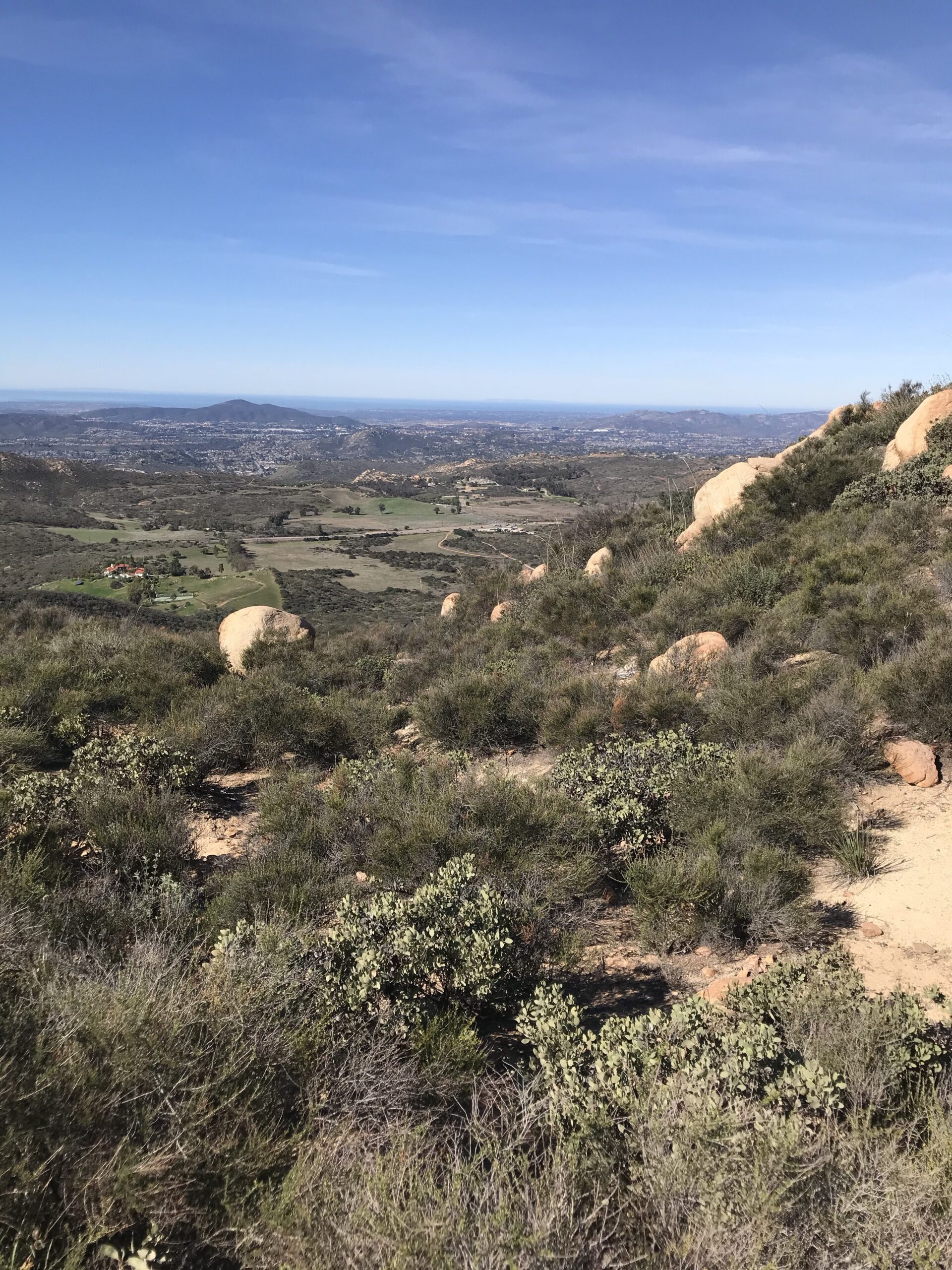 The last leg of the trail offers incredible views west including the parking lot far below, Hwy. 67 and on a clear day the Pacific Ocean. From this vantage point, you can gauge how high you have climbed. Look close and you can see Bernardo Mountain. Look north and you can see Iron’s sister hike, Mt. Woodson and the TV and radio towers adorning the Woodson summit.
