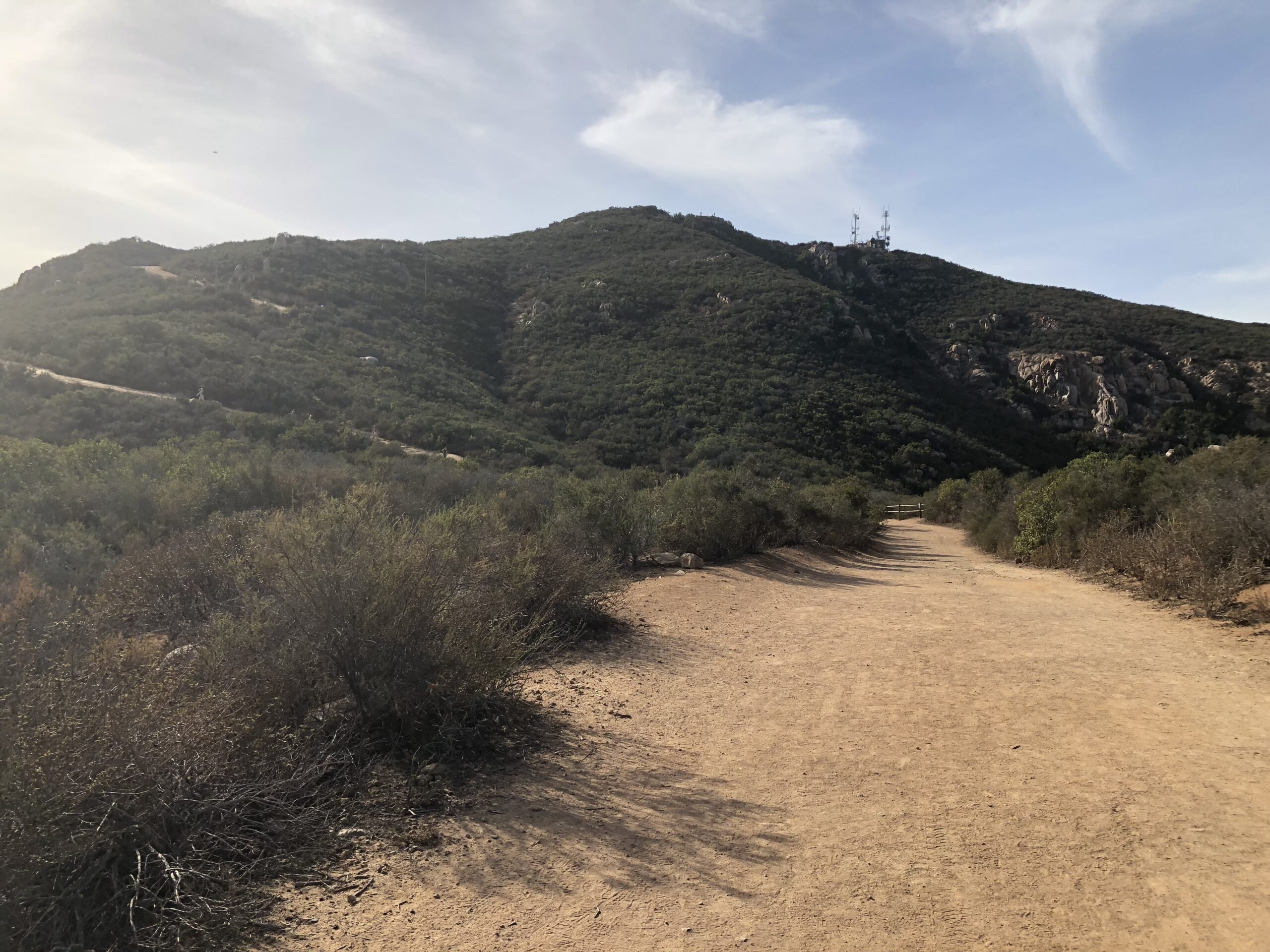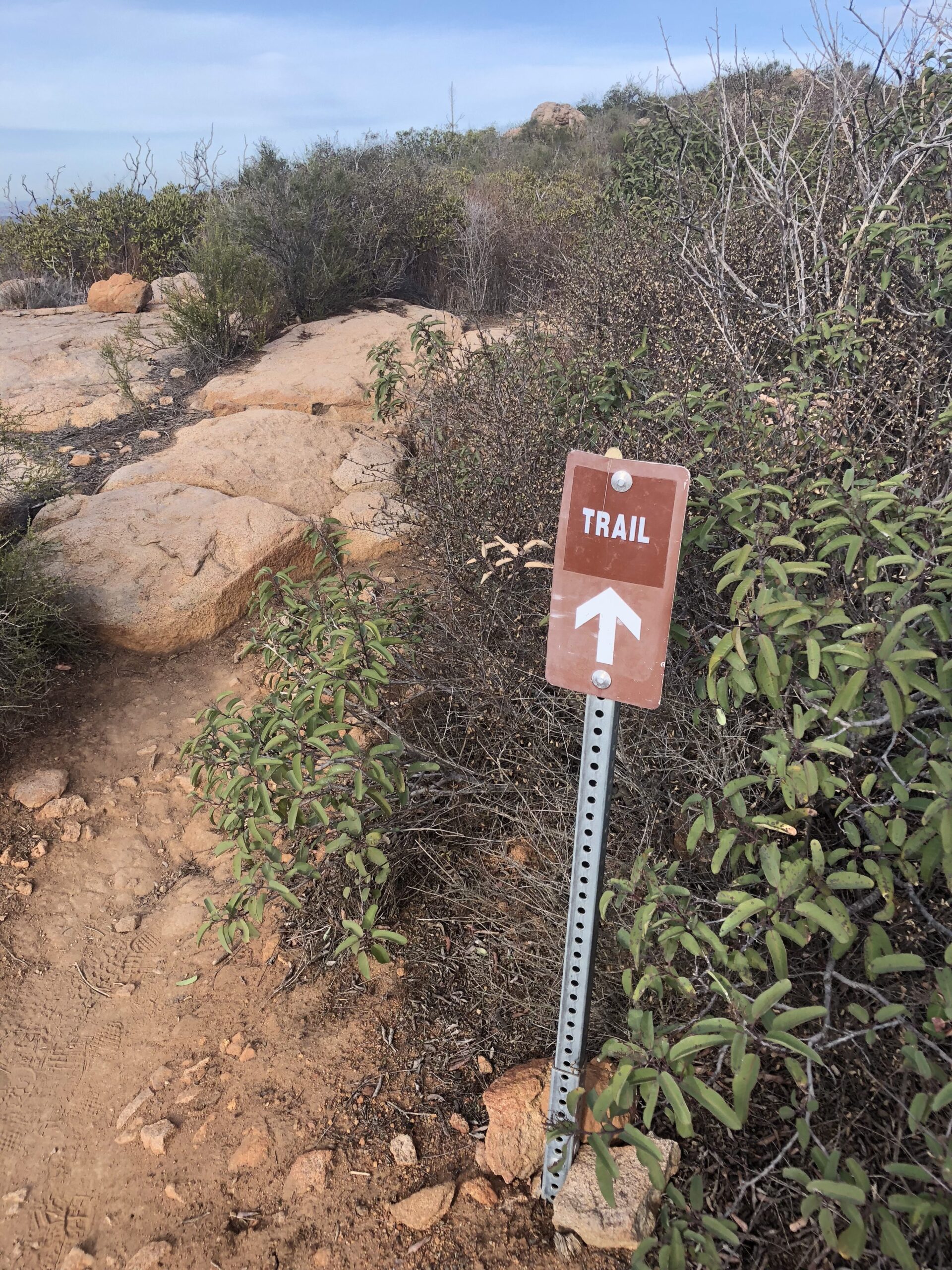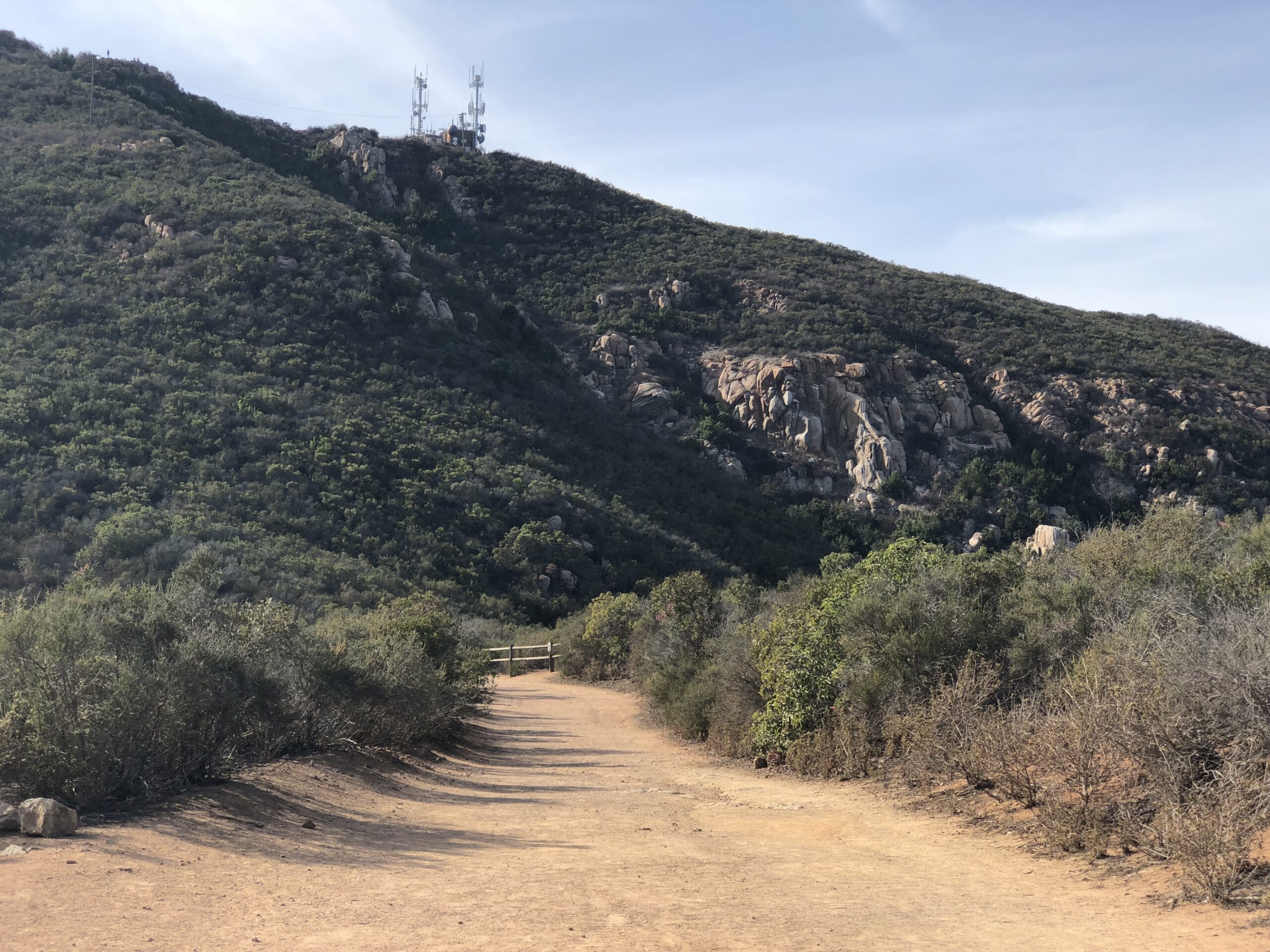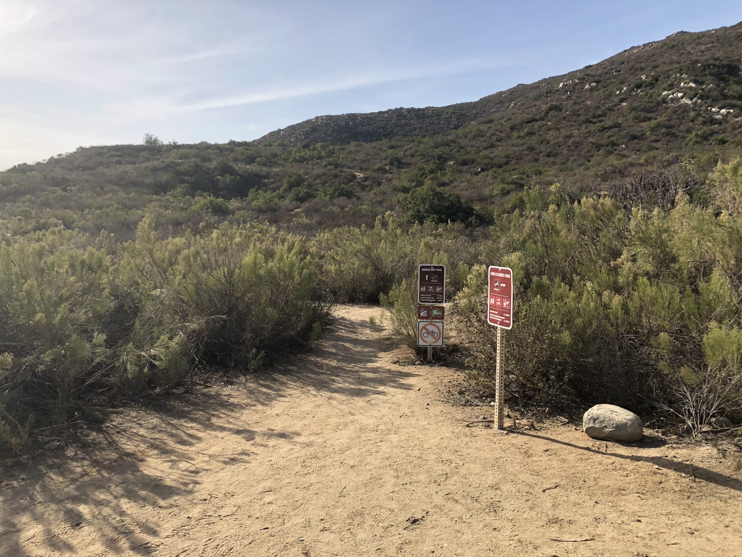 The trailhead for this hike starts at Barker Way In Santee, CA. I like this start due to its less populated trailhead and easier parking. There are also restrooms here for convenience. The trail start is flat, sandy and wide. After 100 yards you will come to a sign that points you left and up towards Cowles, do not go left, continue on the trail as it veers right and up and on your way to the top of Cowles. The trail here starts to climb to the 3/4 mile, then plateaus for awhile then climbs the entire way.