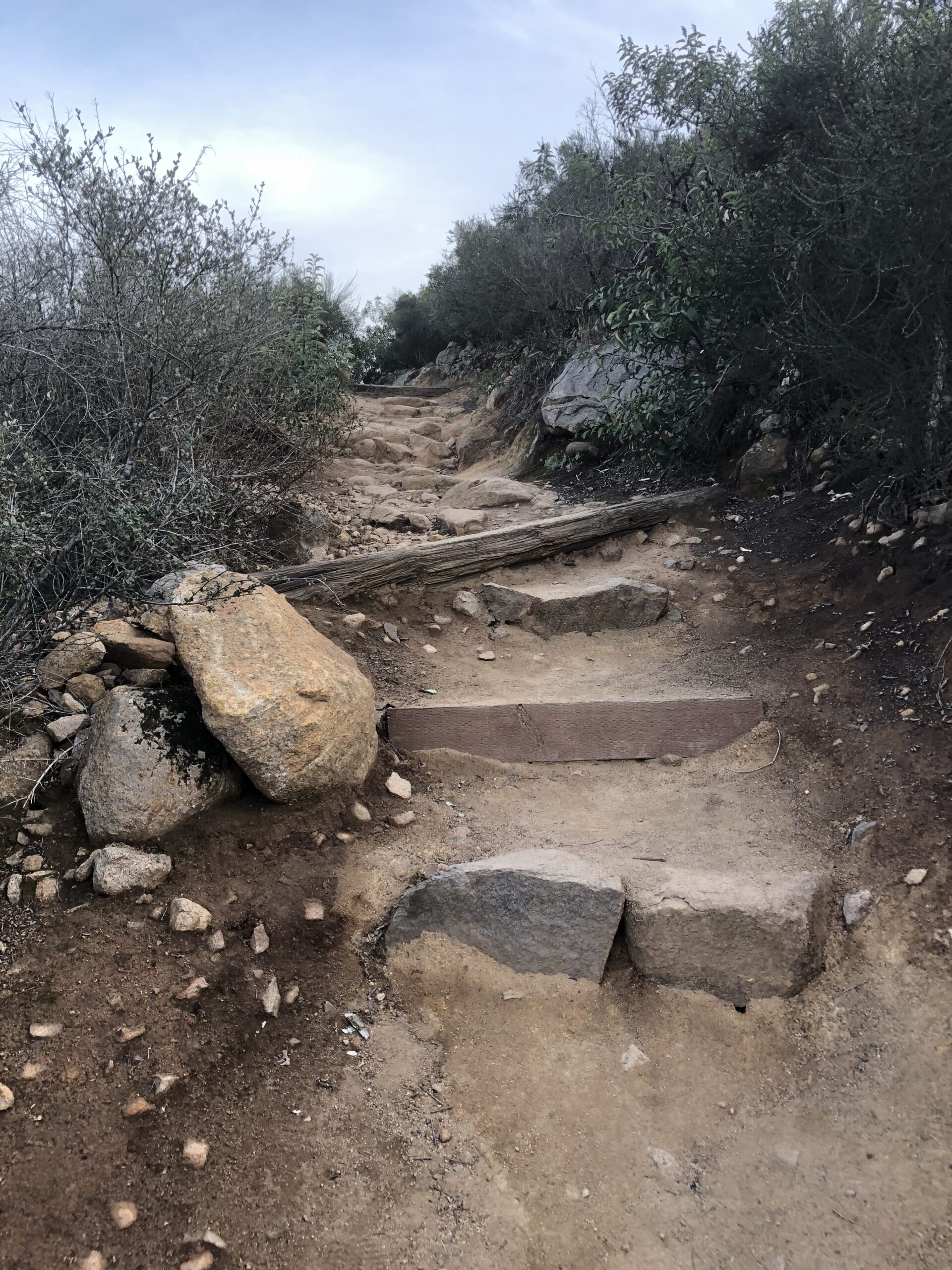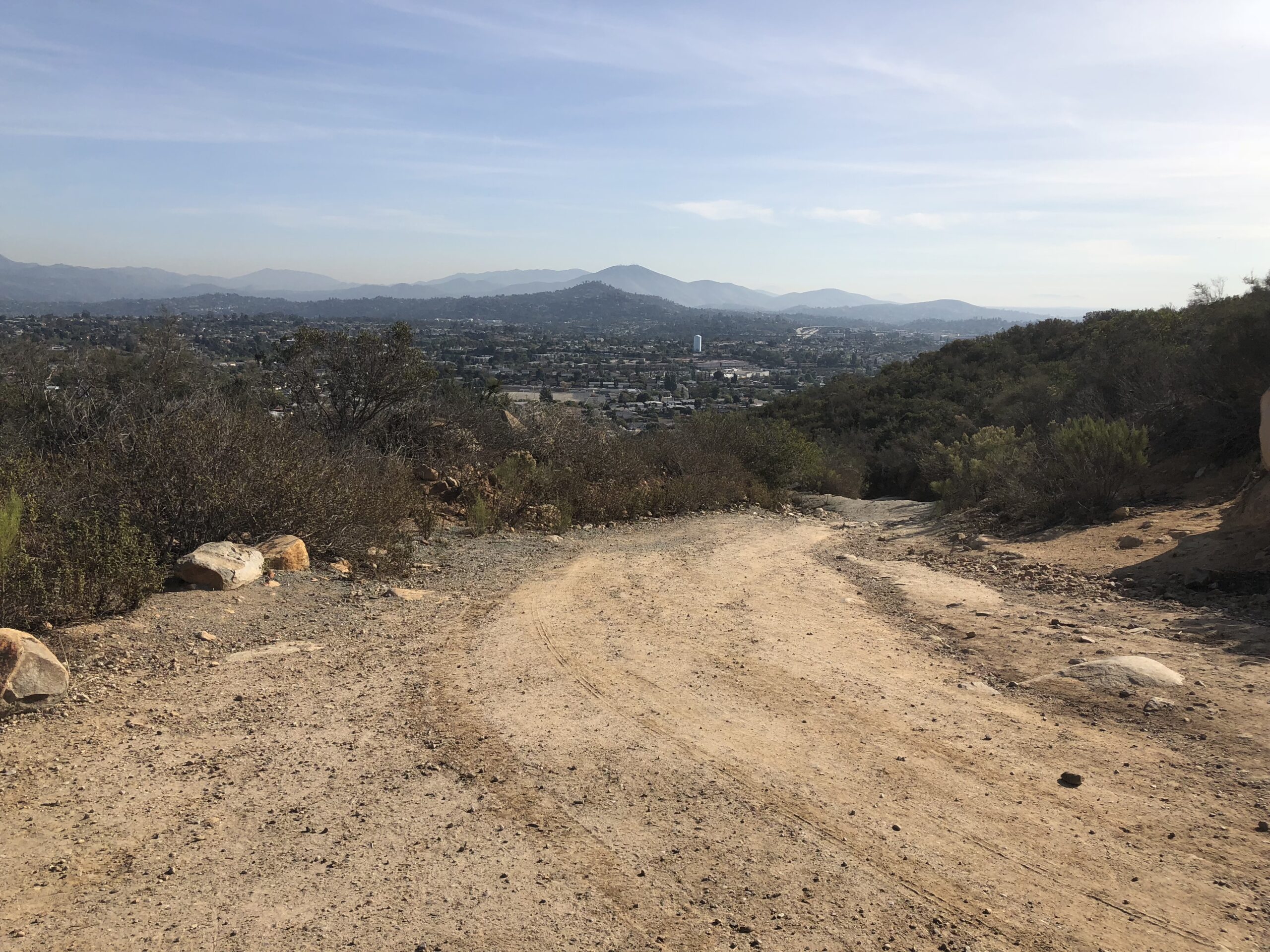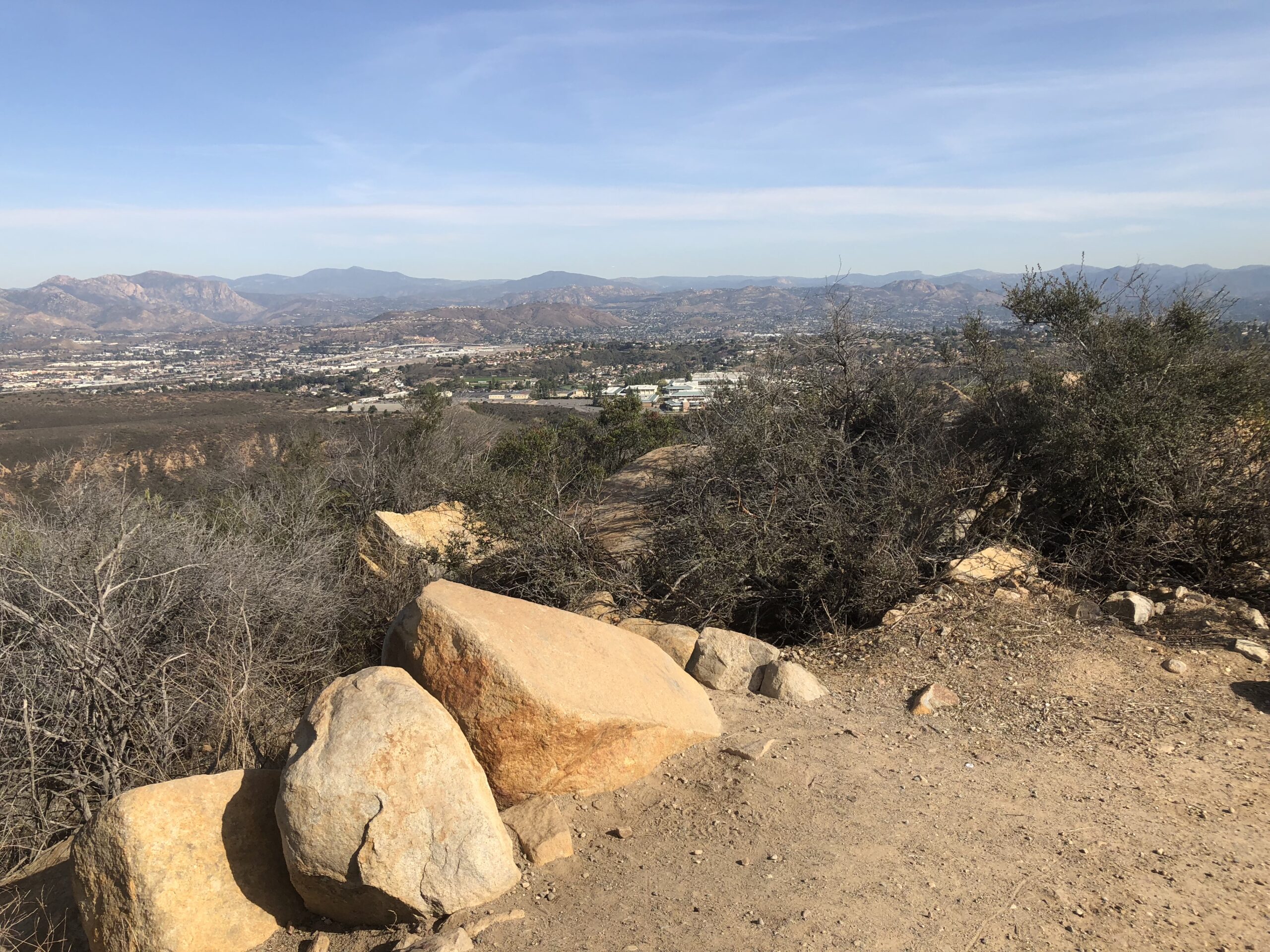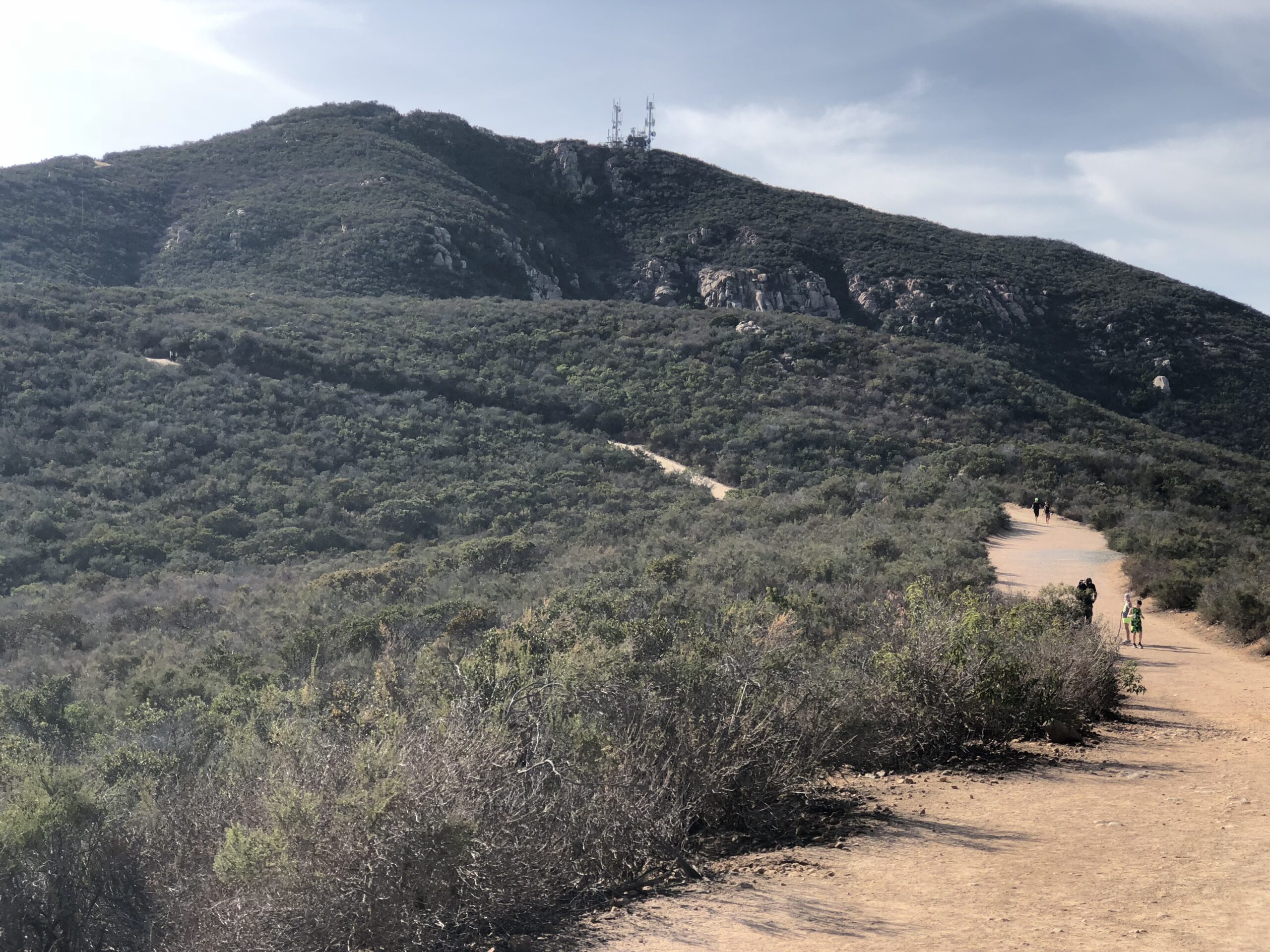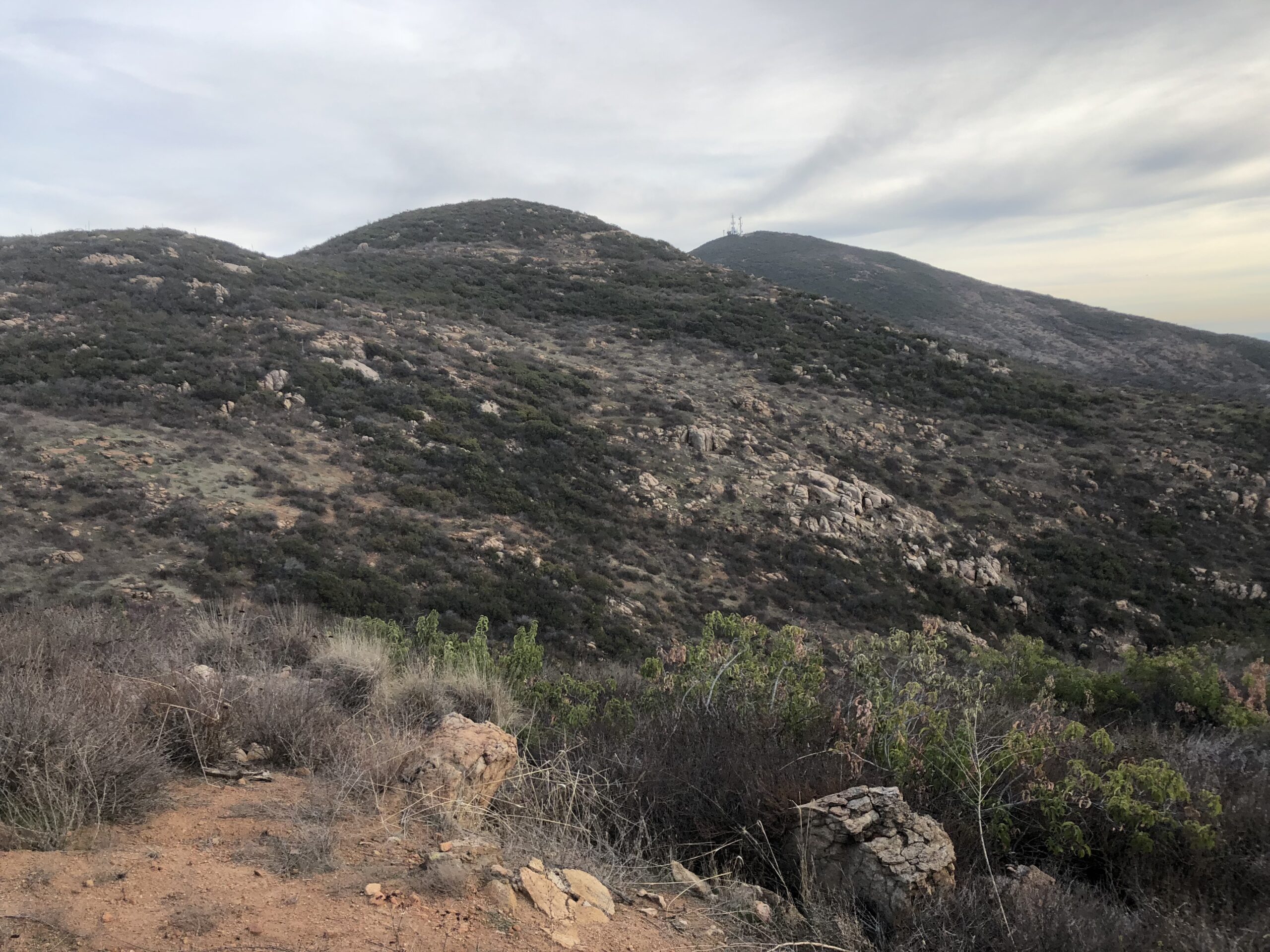 The ascent switchbacks up to the Peak and gets narrow and rocky in spots. Again this is the most diffocult part of the Hike over from Cowles. As you approach the “Pyles Peak Rock” marking your arrival to the summit you will be greeted by the Pyles Peak sign, indicating that you have made it to your second peak of the day. Take in the views, have another snack and scan the surrounding ares between and Cowles and beyond. Looking directly across south you can see the Peak of Cowles Mountain and the radio towers. Although this is a much smaller Peak than Cowles, it is less crowded and in fact for a good amount of my time at the Summit I was the only person there. Another couple came by and we talked. They had been to the other 3 peak in the Mission Trails system this day and just had come over from Cowles, thus making this their 5 of 5 peaks for the day. Nice work indeed! For me the descents challenge me more than the ascents and the descent down the trail from Pyles is challenging indeed. The trail down is about .25 miles and before you know it you will meet up with the main trail junction, go left and follow trail now mostly ascending, back over to Cowles, the radio towers and your journey back.