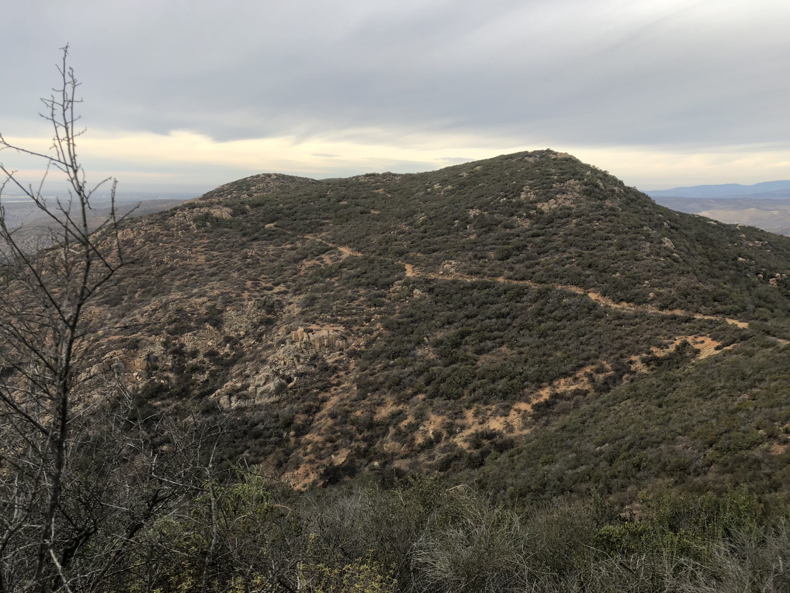 However, as you hike along you will see a set of wooden steps and as you do, make a left to get up to the rocky section of the Peak of Cowles and the path up to the monument. I always love the views from Cowles. Looking North east you see East County and El Cajon Mountain, looking South you can see Mexico, to the Southwest Pt. Loma and looking direct west some of the other peaks in our county including Iron Mountain, Mt Woodson, Black Mountain and on a very clear day the Pacific Ocean. At this point you will have climbed approximately 1.6 miles. I walked around a bit at the peak and added another .4 mile. You can directly see Pyles Peak, looking West from the summit of Cowles.