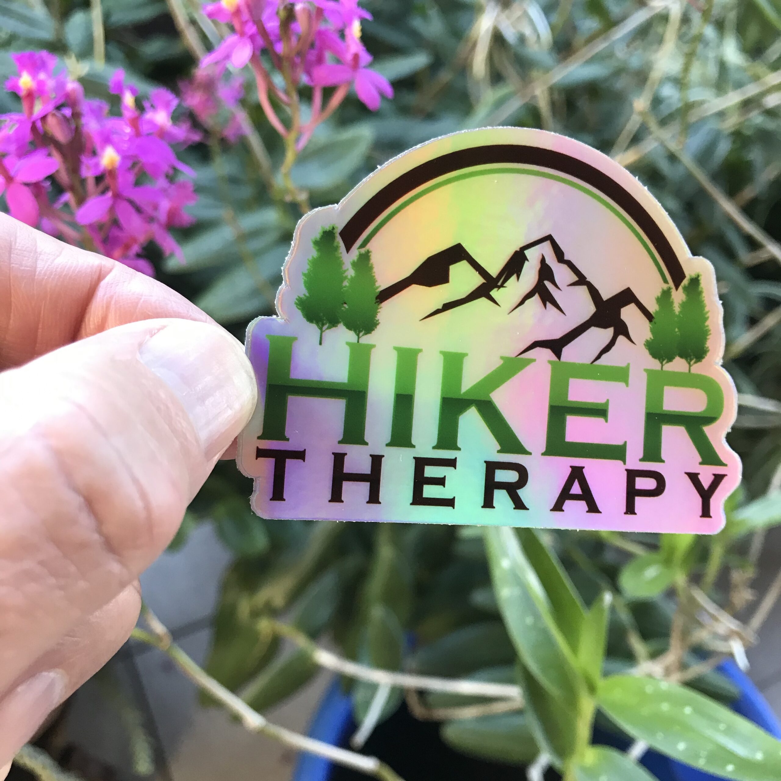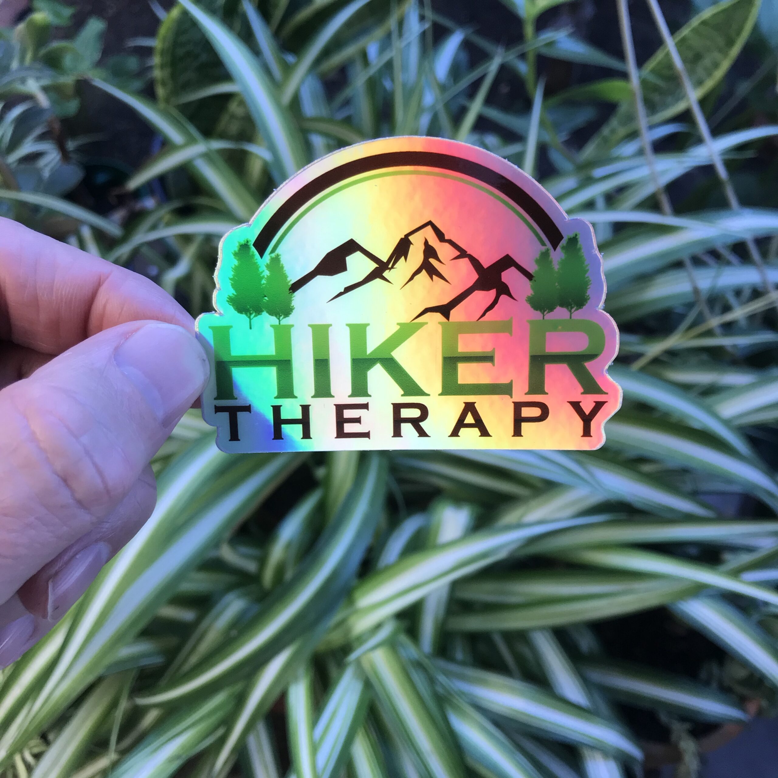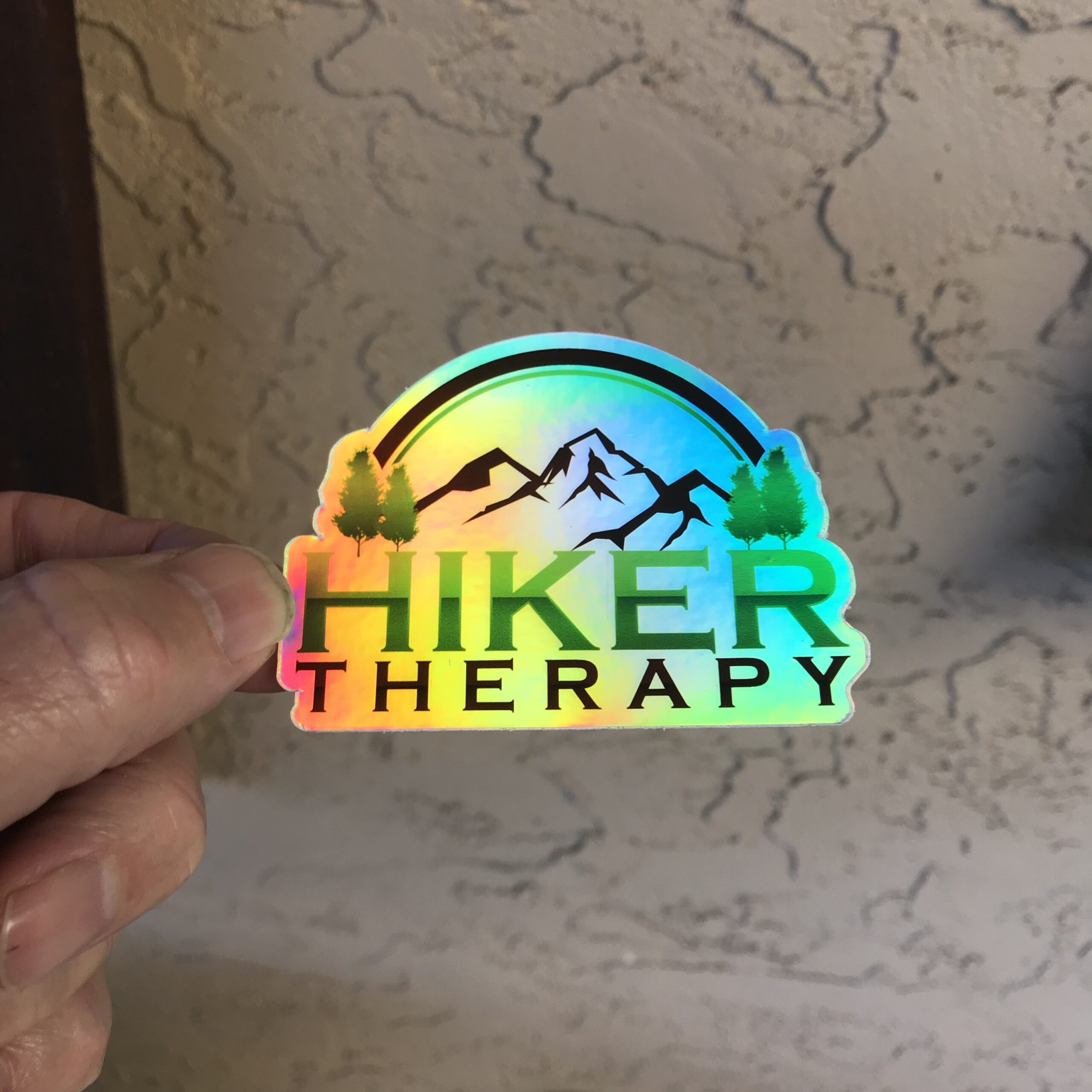 Beautiful 3″x3″ foil Hiker Therapy Alternate Logo Holographic sticker. These stickers shimmer in the sun-light and reflect a rainbow of colors. Great for bottles and laptops.