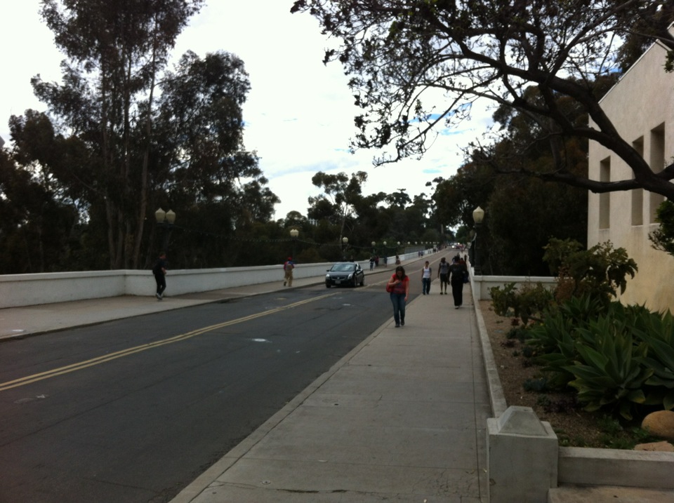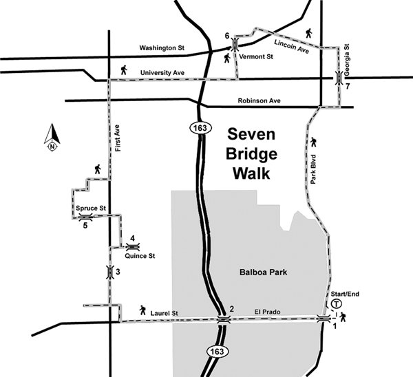 After crossing the Park Blvd. Bridge #1, hike straight ahead to El Prado passing Balboa Park museums and the lily pond, continuing across Bridge #2, the 1914 Laurel St. bridge,